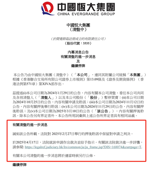 今年3月10日,中国恒大公告指出,2月27日举行的押后聆讯上,法院经听取分别代表清盘人、破产管理署署长及一名最终持有人作出的陈词后押后判决,并将于稍后作出裁决。